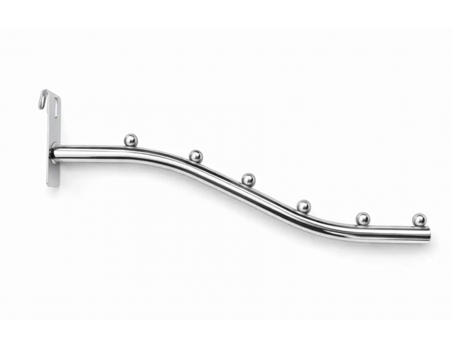 Металлическая флейта-кронштейн для торговой сетки — удобный элемент торгового оборудования, который позволяет эстетично и компактно размещать одежду и аксессуары на вешалках. Простое крепление и современный хромированный дизайн делают её отличным выбором для любых витрин.