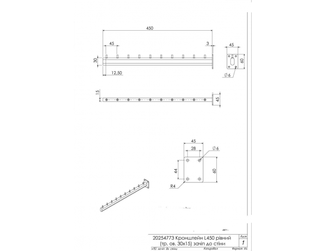Кронштейн Флейта с Креплением к Стене 45 см, черный, ровный