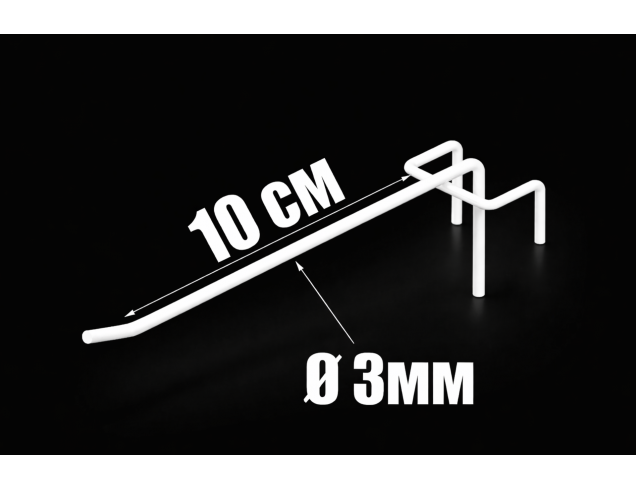 Металевий гачок довжиною 10 см та діаметром 3 мм ідеально підходить для сіток з вічком 50×50 мм. Забезпечує зручне розміщення дрібних та середніх товарів у магазинах, шоурумах і на ярмарках. Легко монтується, має високу міцність та стійкість до зносу.