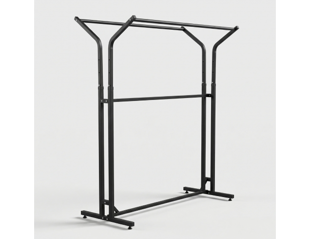 Металева рама забезпечує міцність і стійкість під час щоденної експлуатації. Регульована висота від 1,30 до 1,70 м дозволяє адаптувати стійку під різні види одягу — від легких виробів до верхнього одягу.
